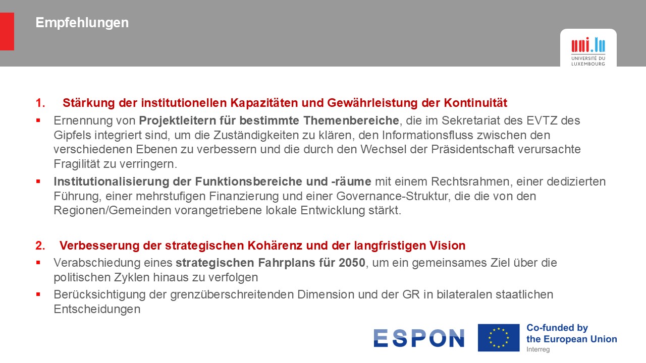Die politische Governance muss sich auf mehrjährige Prioritäten stützen, über die Zweijahreszyklen hinweggehen und thematische Taskforces schaffen, die in der Lage sind, strategische Projekte langfristig zu begleiten. Eine verstärkte Koordinierung zwischen den Institutionen und eine klarere Kommunikation sind unerlässlich, um das Vertrauen wiederherzustellen und den Bürgern mehr Visibilität zu verschaffen.