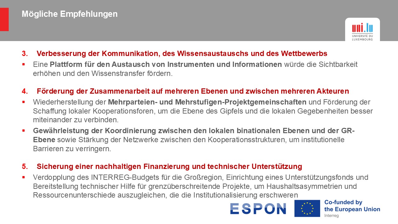 Für Herrn Willy Borsus, “ist das Problem nicht die wechselnde Präsidentschaft, sondern die Kommunikation zwischen den verschiedenen Ebenen der nationalen Regierungen und den beteiligten Akteuren“, wobei er betonte, dass „die Großregion ein verständlicheres politisches Sprachrohr benötigt, damit die Akteure wissen, an wen sie sich zur Lösung dieses oder jenes grenzüberschreitenden Problems wenden können“.
