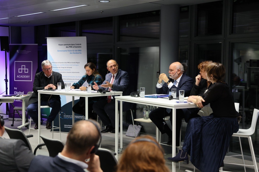 Le 20 novembre 2025, le Conseil Interrégional des Chambres des Métiers (CICM), en partenariat avec le Digital Learning Hub (DLH), le Conseil Parlementaire Interrégional (CPI), le Comité Économique et Social de la Grande Région (CESGR) et la Deutsch-Luxemburgische Wirtschaftsinitiative (DLWI), a organisé une table ronde au Digital Learning Hub à Belval autour du thème :